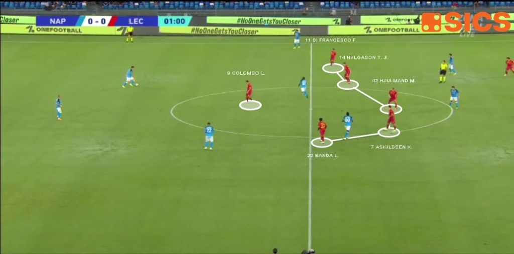 Contro il Napoli, agevolati anche dalla scelta di Spalletti di cominciare la sfida senza Lobotka e con una mediana a due composta da Ndombélé e Anguissa, i salentini sono riusciti ad ingolfare la fase offensiva partenopea, provando quando possibile (nel primo tempo) a risalire il campo.