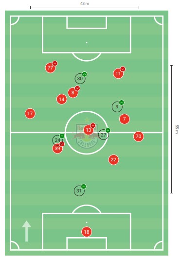 RB Salzburg players’ average position against WSG Swarovski Tirol.