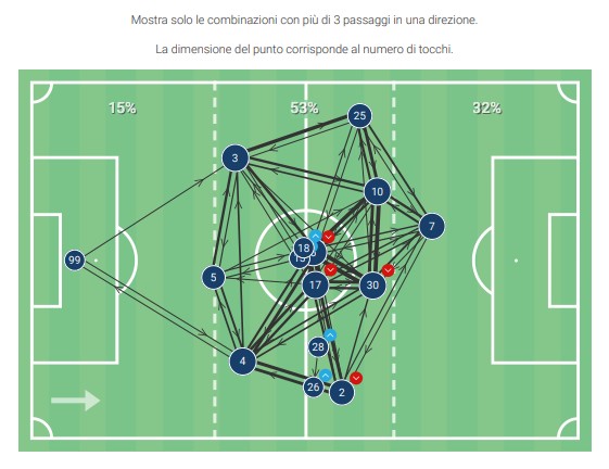 L’inizio di partita, al di là del gol, faceva presagire una Juventus più europea, orientata a difendere pressando in avanti uomo su uomo, salvo poi rifugiarsi nelle consuete lunghe fasi di difesa posizionale bassa volta alla chiusura degli spazi più che all’aggressione alla palla.