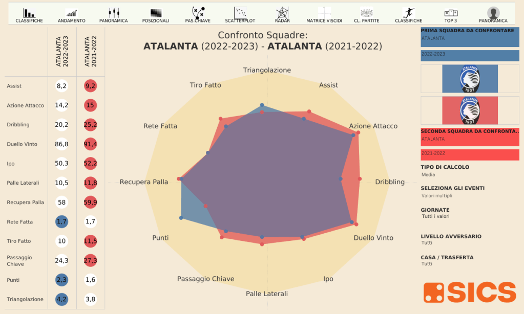 Confrontando i dati generale dell’Atalanta 2021/22 con quelli del 2022/23 notiamo anche come lo scorso anno la squadra nerazzurra vincesse più duelli e registrasse più passaggi chiave (in transizione spesso ci sono meno linee da superare).