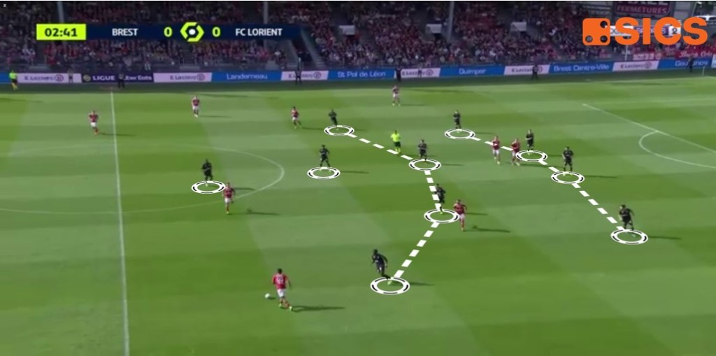 L’idea è appunto quella di rimanere compatti, corti e stretti, in un sistema difensivo a zona che lasci palla agli avversari (solo 41.9% la media di possesso palla della compagine bretone) al fine di creare campo alle spalle della linea difensiva rivale, da sfruttare poi in contropiede con i vari Ouattara, Diarra e Moffi.