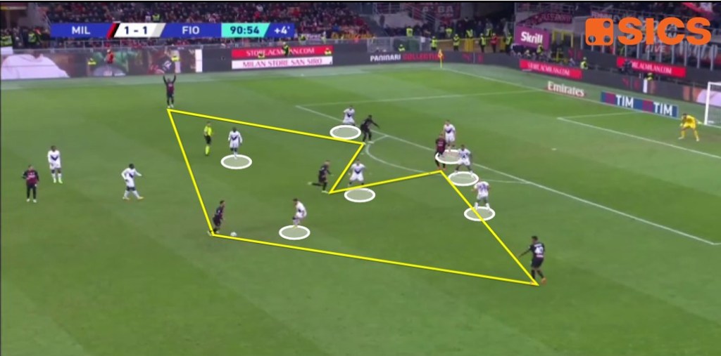 Contro questo approccio, che portava anche 6-7 uomini sopra linea palla, il Milan rispondeva serrando le linee e cercando di bypassare la pressione gigliata attraverso palle lunghe rivolte verso Giroud e Leão.