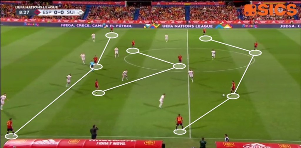 Gli automatismi offensivi nel gioco posizionale degli spagnoli poggiano poi molto sul lavoro degli esterni alti, posizione nella quale Luis Enrique può contare sull’enorme qualità offerta dai vari Pablo Sanabria, Dani Olmo, Ansu Fati e Ferran Torres, ai quali si aggiungono le due frecce Nico Williams e Yeremy Pino.