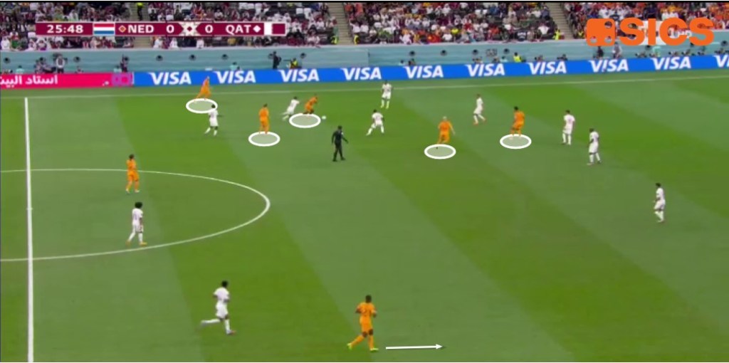 L’altra novità riguarda il modo di sviluppare di una squadra che solitamente tende ad avere un mediano più bloccato e l’altro (Frenkie de Jong) che si comporta anche da invasore andando a formare un quadrilatero offensivo con il trequartista (Cody Gakpo o Klaassen) e le due punte. Infine c’è il sovraccarico del lato sinistro del campo per attaccare da quel lato o per cercare poi il cambio di gioco sul fronte opposto.