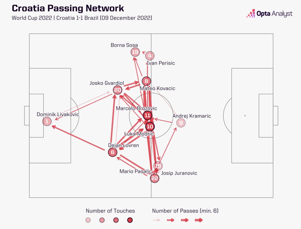 Brozović (35 passaggi riusciti), Modrić (35) e Kovačić (28) sono stati ancora una volta protagonisti in un palleggio croato che ha permesso alla nazionale dalla maglia a scacchi di registrare lo stesso tempo di possesso (50%) del Brasile.