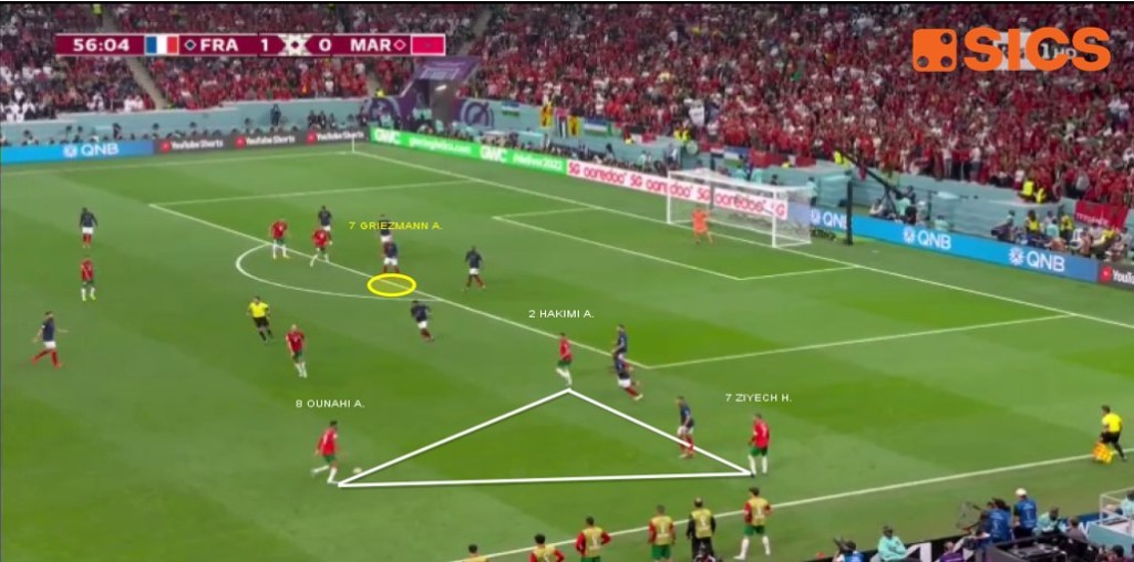 La costante fra i due sistemi è stata la linea alta e l’atteggiamento propositivo, favorito dallo svantaggio precoce che ha scombinato i piani inziali. Con la Francia ben lieta di giocare in transizione, il Marocco ha esercitato il dominio per quanto riguarda il possesso (61%).