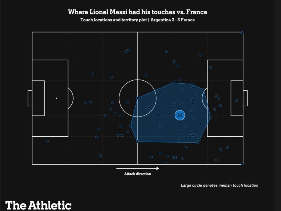 Questa scelta iniziale non si rivelava azzeccata e questo non solo per la pressione argentina di cui sopra, ma anche per una generale lentezza dei francesi nel muovere palla quando in possesso. In non possesso inoltre il piano tattico predisposto da Scaloni, che prevedeva Messi a gravitare nella sua comfort zone (il mezzo spazio destro) fra Rabiot e Dayot Upamecano, sul lato sinistro di Tchouaméni, creava non pochi problemi ad una fase difensiva non molto compatta fra le linee (verticalmente) e nemmeno fra giocatore e giocatore (orizzontalmente).