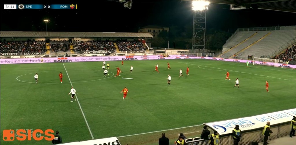 Nel video seguente (montato con VideoMatch di Sics) vediamo una di queste situazioni. La Roma costruisce dal basso ma la palla giocata da El Shaarawy è pigra e sbagliata. La ripartenza breve dell’Empoli viene però troncata sul nascere da un intervento di Matić che, venuto incontro per aiutare l’uscita palla, cambia velocemente la propria attitudine mentale per intervenire difensivamente su Baldanzi.