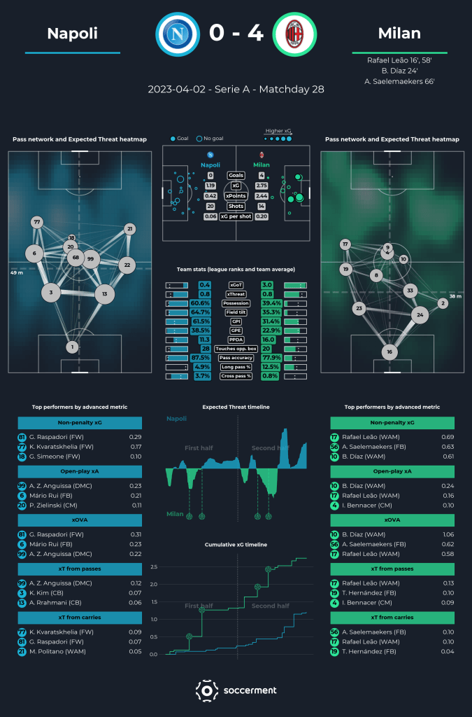 A rendere ermetica la fase difensiva milanista è stato inoltre lo straordinario sacrificio difensivo messo in campo da Rafa Leão, Olivier Giroud e Brahim Díaz. Insieme ai centrocampisti i tre attaccanti del Milan hanno infatti impedito al Napoli di rendere fluido e fruttuoso il suo palleggio, chiudendo anche gli spazi di mezzo e limitando i due esterni bassi di casa (Mário Rui e Giovanni Di Lorenzo) ad un totale di 7 passaggi chiave.
