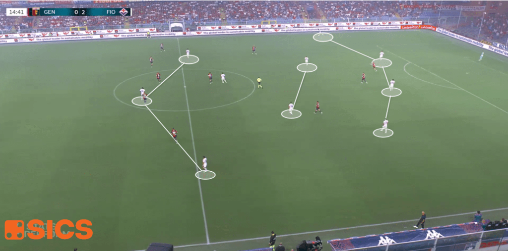 Tornando all’utilizzo dei terzini da mezzali, questa mossa non è servita alla Fiorentina solo per riempire i mezzi spazi in possesso e, in non possesso, per avere due giocatori già ben posizionati per la riaggressione, ma anche per avere due elementi pronti nella fase di risalita del campo.