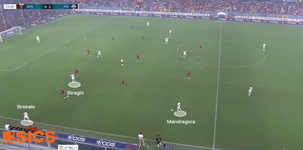 Questo è stato evidente soprattutto sul lato sinistro, dove operava Biraghi, con 115 palle giocate il viola più coinvolto nella fase di possesso gigliata. Spesso infatti, con azione che iniziava sul lato opposto del campo, il pallone veniva girato ad uno smarcato Biraghi, che poteva così portarlo in avanti facendo guadagnare campo alla propria squadra.