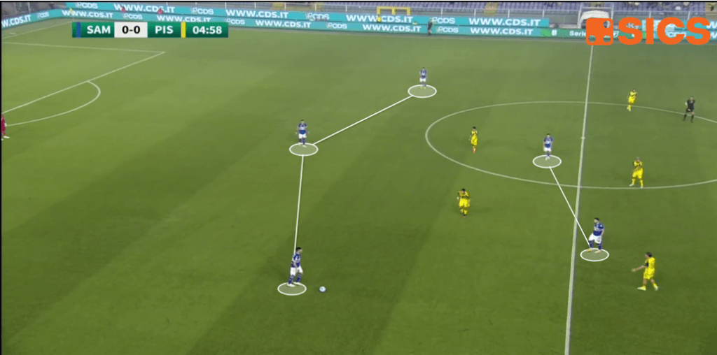 Detto questo, la Samp ha cercato di orientare il possesso fin dalla prima costruzione, andando a sviluppare in modo molto fluido dalla propria trequarti. La costruzione bassa invece poggiava sul portiere, giocatore libero sulla forte pressione attuata dagli avanti del Pisa.