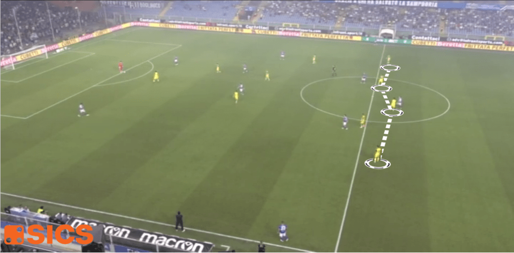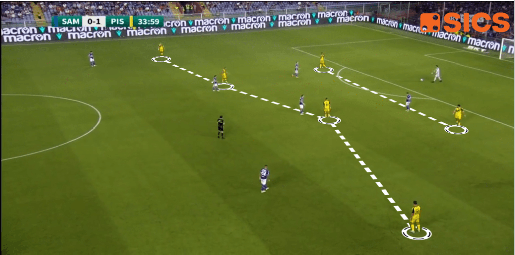 Inoltre, il controllo dei mezzi spazi sfuggiva ai blucerchiati, con il Pisa che lavorava bene anche in situazione di difesa posizionale in zone medie o basse di campo. Questo fra l’altro tenendo una linea difensiva organizzata che finiva per mandare 6 volte in fuorigioco gli avversari.