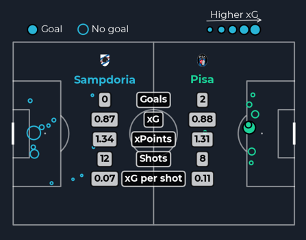 La battaglia degli expected goals è invece finita in parità, con un dato di 0.87 xG per gli uomini di Pirlo e di 0.88 per il Pisa. La formazione toscana ha però prodotto conclusioni più pericolose, con un dato di 0.11 xG per tiro (contro gli 0.07 del Doria).