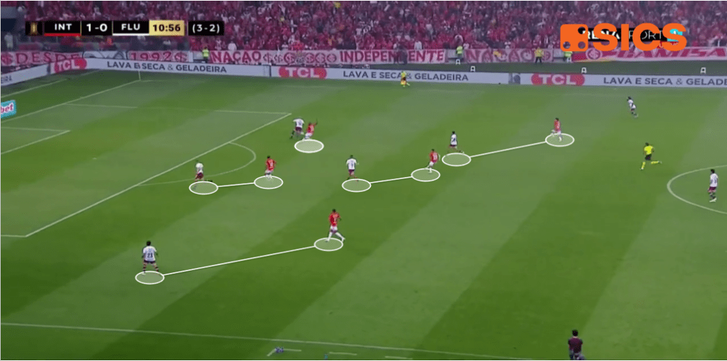 Dopo la gara di andata (finita 2-2), Eduardo Coudet, tecnico argentino del Colorado, ha deciso di affrontare la gara di ritorno al Beira-Rio di Porto Alegre (in casa dell’Internacional) andando a pressare la formazione di Diniz, nonostante le difficoltà che questo atteggiamento può comportare contro una squadra che accumula tanti giocatori in zona palla.