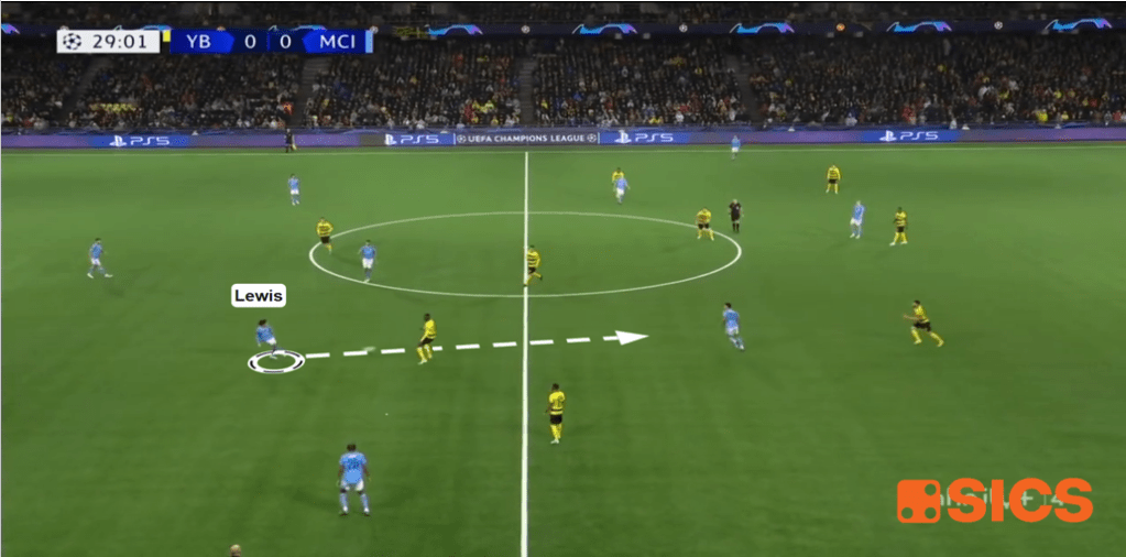 Nella partita con gli svizzeri, Lewis ha agito in quella classica posizione ibrida terzino/mezzala che caratterizza il gioco di Guardiola. Successivamente, contro l’Arsenal, il tecnico catalano ha tenuto Lewis più dentro il campo per sopperire all’assenza di Rodri.