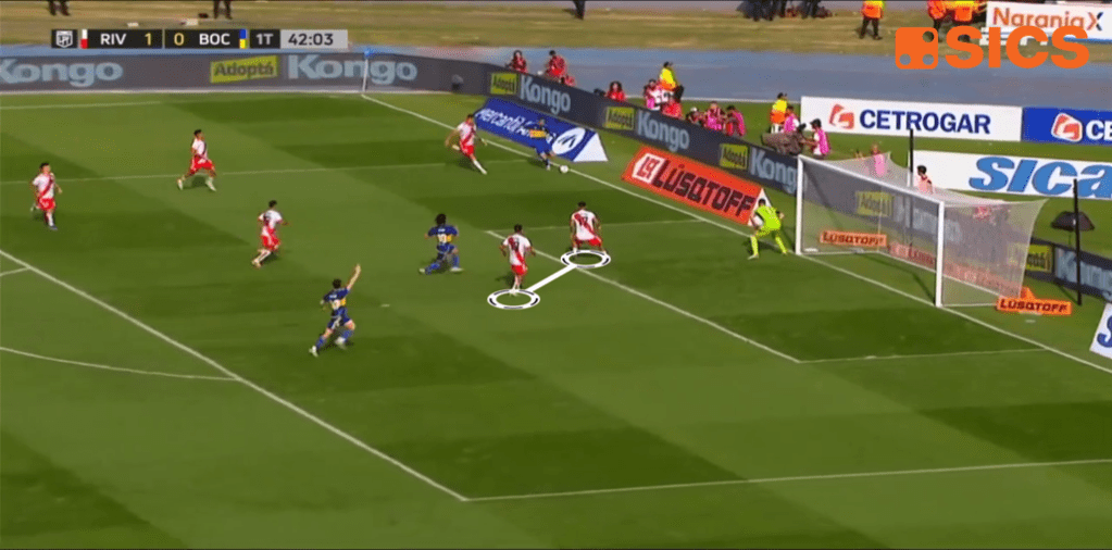 Nel secondo fermoimmagine notiamo poi come il reparto difensivo sia rimasto con soli due uomini, che si dispongono in diagonale negativa sul cut-back che il Boca sta per produrre.