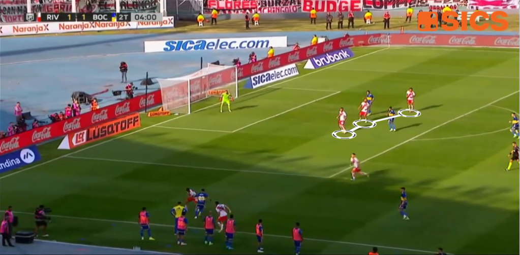 Nel primo momento preso in esame la linea difensiva del River evidenzia il proprio orientamento sul posizionamento della palla. I tre difensori che restano a presidio dell’area di rigore infatti, su palla esterna non hanno la volontà di prendere la marcatura degli attaccanti del Boca, preferendo invece marcare l’eventuale traiettoria.
