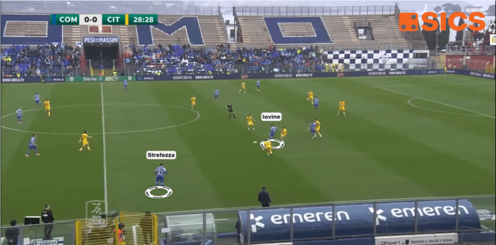 Nella fase iniziale del possesso il Como può dunque organizzare una uscita ragionata dal basso così come andare diretto per Cutrone e Gabrielloni, saltando la prima pressione avversaria.