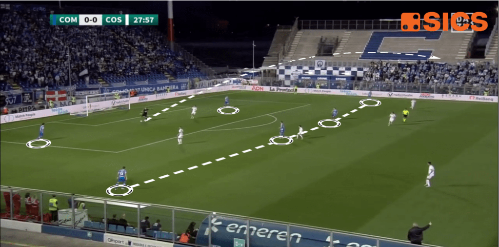 Come in ogni proposta posizionale anche nel Como la fase di costruzione assume un’importanza rilevante. In base ai dati Soccerment, la compagine lariana è quattordicesima nella serie cadetta per percentuale di palloni lunghi giocati dal proprio portiere con un dato (47%) inferiore a quello medio del resto del campionato (53.90%).