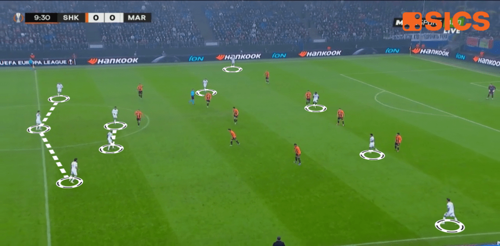D’altronde è stato lo stesso Gasset a dichiarare quest’anno che «bisogna essere ibridi…biisogna essere in grado di pressare ma, dato che è difficile pressare per tutta la partita, bisogna essere in grado di arretrare trenta metri per giocare in contropiede». Di seguito quindi, con l’aiuto di con VideoMatch Presenter di Sics, vediamo alcune strutture presentate dal Marsiglia sotto la gestione del tecnico di Montpellier. Nel primo caso osservimao un momento della fase offensiva marsigliese nella gara di Europa League in casa dello Shakhtar Donetsk.