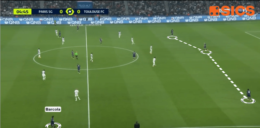 Oppure, sull’altro lato del campo, c’è stato un avvio di stagione caratterizzato dal movimento in ampiezza di Vitinha, che si allargava per andare a prendere lo spazio lasciato libero dal movimento opposto (ad accentrarsi a fianco della prima punta) operato da Mbappé.