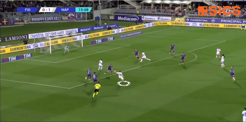 Non solo: muovendosi verso i corridoi centrali del campo Kvaratskhelia avrebbe anche la possibilità di andare direttamente alla conclusione, magari da fuori area. In base ai dati Sics nella Serie A appena conclusa il georgiano risulta aver effettuato il 59.52% dei suoi tiri totali (124) calciando da oltre i sedici metri avversari.