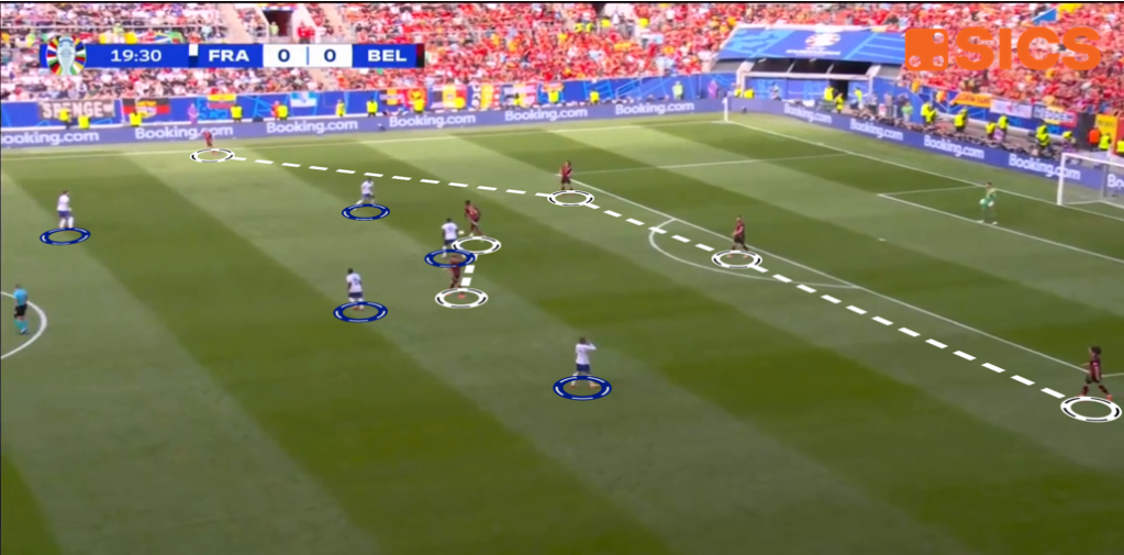 Col Belgio che difendeva in blocco medio – basso in un quadrato 4-4-2, gli spazi liberi la Francia li trovava sulla propria destra con Jules Koundé. Il laterale del Barcellona spingeva molto da quel lato, ingaggiando un duello interessante con un Jérémy Doku spesso costretto a fungere da terzino aggiunto nello scacchiere belga.