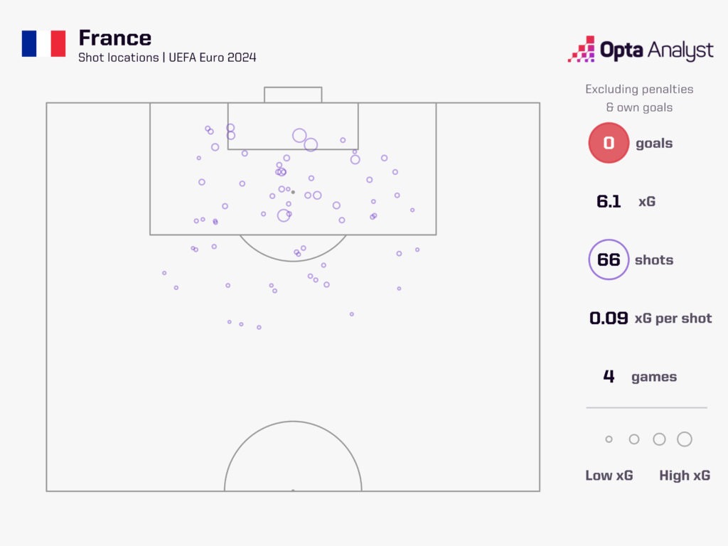 I francesi vanno ai quarti di finale solo grazie all’ennesimo autogol a loro favore, il secondo di questo Europeo. L’unico altro gol realizzato dai francesi è quello messo a segno su rigore da Kylian Mbappé contro la Polonia. La formazione transalpina conclude molto in questo torneo (66 volte secondo i dati Opta) ma con un dato di appena 0.09 xG per tiro.