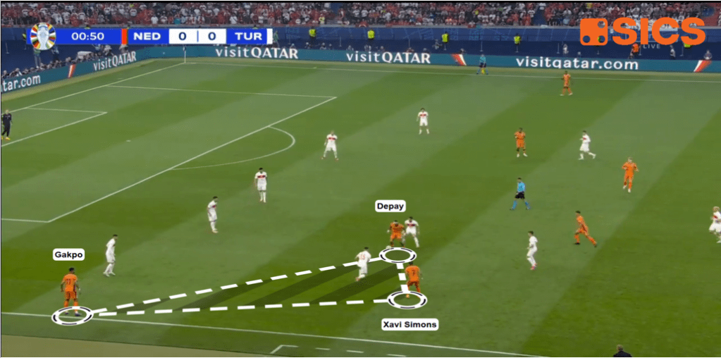 In più, la Turchia ha adottato la stessa strategia difensiva vista all’opera nelle precedenti gare, preoccupandosi di coprire le zone centrai del campo e lasciando così libere le corsie laterali. Stavolta però in area di rigore non c’era un falso nueve, ma un attaccante di stazza come Weghorst, pronto a raccogliere e smistare gli inviti dei compagni.