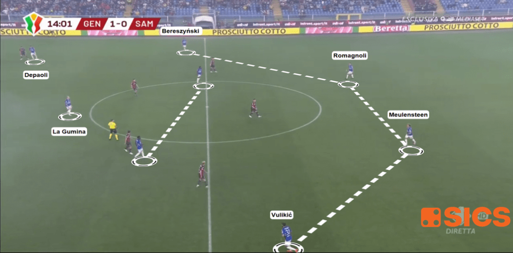 All’interno di due contesti estremamente verticali la Samp proponeva un’interpretazione liquida del suo 3-5-2 di partenza. In situazione di secondo possesso, all’altezza della propria trequarti, i doriani tendevano infatti a costruire a quattro, con uno dei centrocampisti che scendeva accanto a Simone Romagnoli e con il contemporaneo allargarsi di Bartosz Bereszyński a destra e di Stipe Vulikić a sinistra.