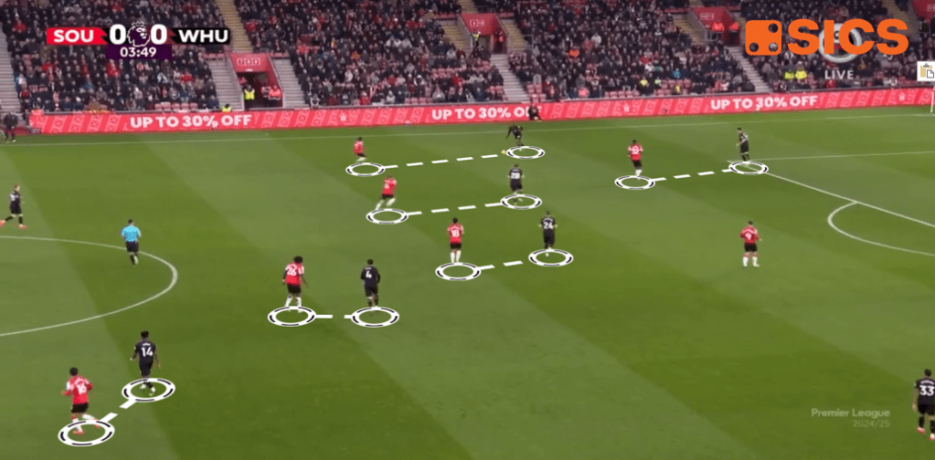 A tal proposito è da notare come il Southampton sia passato da un dato medio di 11.46 di PPDA con Martin a quello di 7.97 registrato contro il West Ham. Insomma, difensivamente si è già vista una squadra aggressiva in avanti, che ha costruito una serie di duelli individuali a tutto campo.