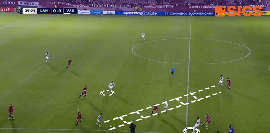 Guardando al posizionamento medio dei giocatori vascaínos fornito dal report di Sics si nota ad esempio la classica diagonale offensiva di matrice brasiliana, tipica del calcio di Diniz, formata dal terzino destro Paulo Henrique, dall’ala Rayan Vitor, dal centravanti Pablo Vegetti e dall’ala sinistra Nuno Moreira.