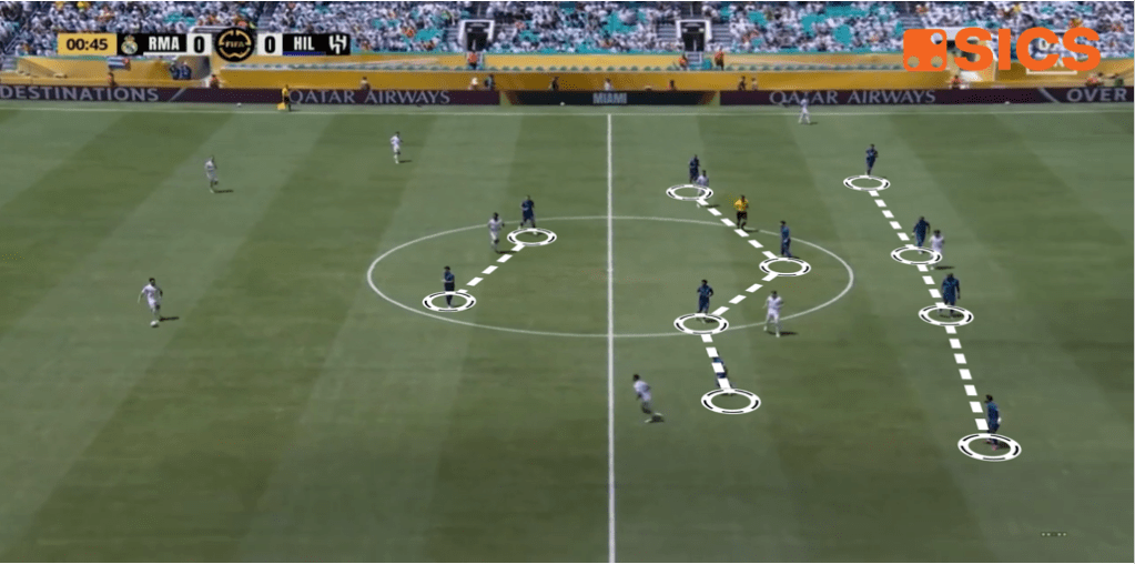 In generale l’Al-Hilal ha utilizzato sovente la mossa della palla diretta verso Milinković-Savić per evitare il pressing del Real Madrid. Da parte loro gli spagnoli sono stati organizzati da Xabi Alonso in un 4-3-3 che ha però incontrato diverse difficoltà. I blancos hanno fatto fatica a cominciare in modo pulito l’azione da dietro e anche la pressione in avanti (uno dei tratti che dovrebbe distinguere il nuovo Real di Xabi da quello di Carlo Ancelotti) non è stata portata con efficacia. Jude Bellingham (soprattutto) e Vinícius Junior sono poi apparsi poco integrati col resto della squadra.