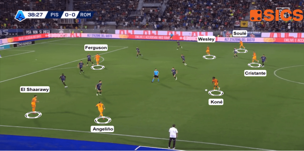Sul lato opposto invece la struttura d’attacco romanista era più tradizionale: Stephan El Shaarawy era l’attaccante aggiunto che partiva dal mezzo spazio mentre Angeliño rimaneva a riempire lo spazio in ampiezza.